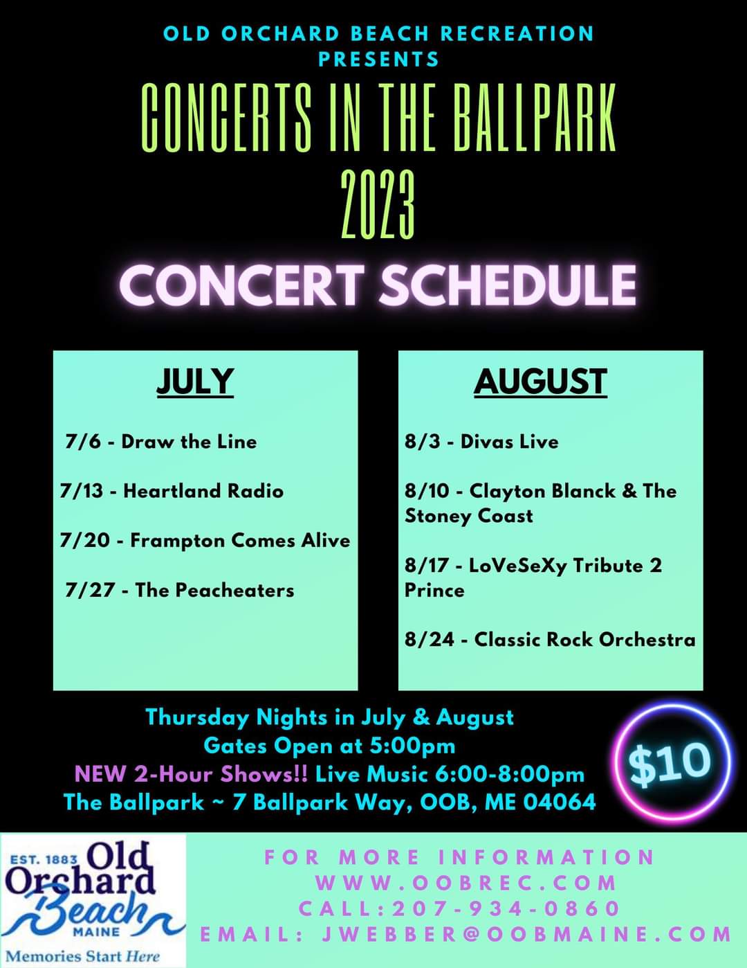 « All Events This event has passed. Concerts in The Ballpark 2023 08-17-23 @ 5:00 pm - 8:00 pm « Town Council Regular Meeting 08.15.2023 Fireworks on the beach in front of Palace Playland » Add to calendar Google Calendar iCalendar Outlook 365 Outlook Live Details Date: 08-17-23 Time: 5:00 pm - 8:00 pm Event Categories: Recreation and Ballpark, Special Event Venue The Ballpark 7 Ballpark Way Old Orchard Beach, ME 04064 United States + Google Map